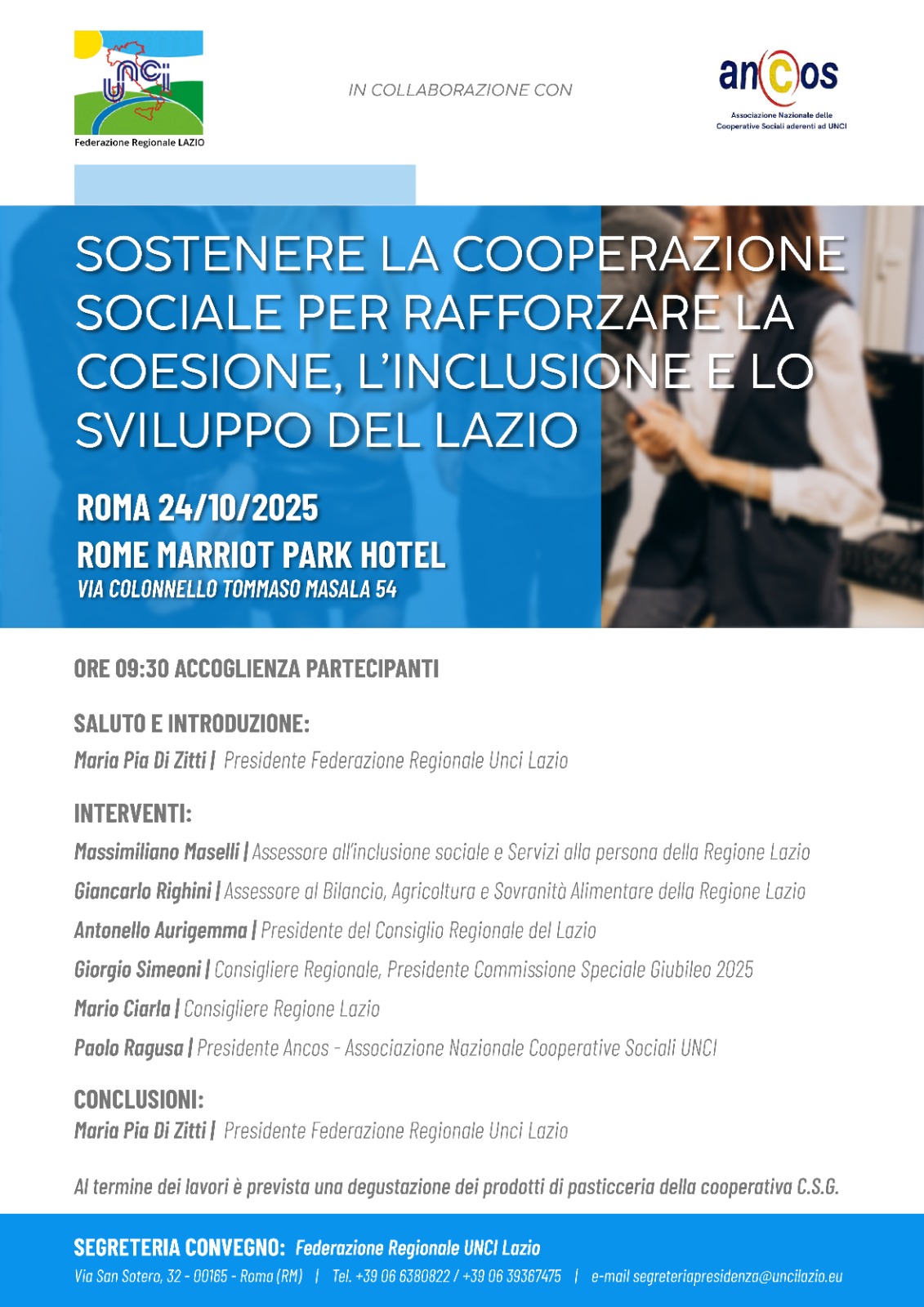 Questo il tema del Convegno organizzato dalla nostra Federazione Regionale UNCI Lazio in collaborazione con ANCOS, che si terrà il 24 ottobre 2025 presso il Marriot Park Hotel Via Colonnello Tommaso Masala n. 54 in Roma. L’evento vuole essere occasione di incontro e dialogo costruttivo tra le Istituzioni Regionali e il mondo delle cooperative sociali Unci, per portare avanti , insieme, il percorso condiviso di sviluppo negli ambiti socio-sanitario, economico ed occupazionale della nostra regione, con particolare riferimento ai bisogni e all’inclusione delle componenti più fragili della collettività.
